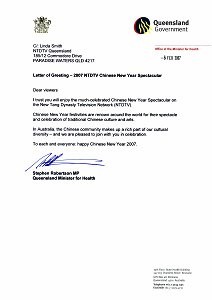 昆省卫生部长Stephen Robertson贺信中说:我相信大家会喜爱这场由新!唐!人:电视台所主办的盛大的中国新年晚会。中国新年在世界上一直都是备受赞誉的中国传统文化及艺术。