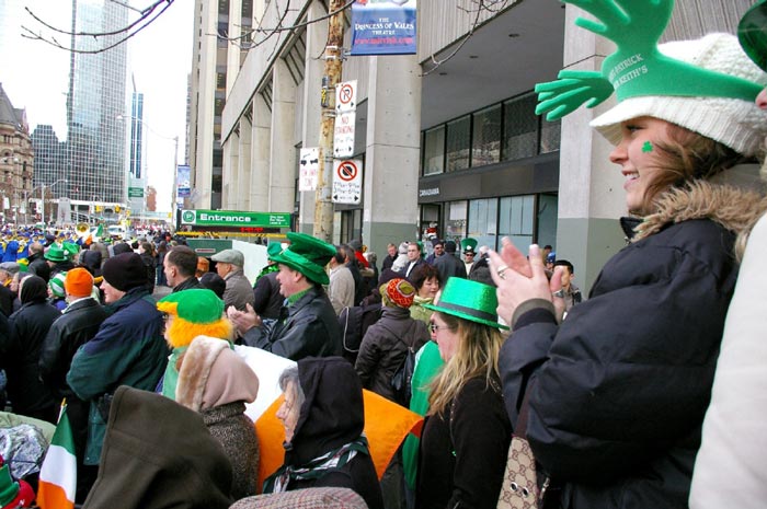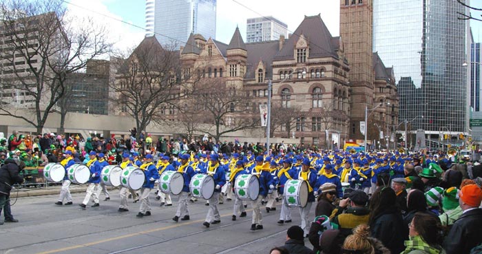 由约一百六十名法轮功学员组成的多伦多天国乐团,出现在有八十多个团体参加的多伦多第二十届圣•派翠克日大游行。中午十二时正,游行队伍从Bloor St.与Devonshire Place交界处开始,行经市中心最繁华的Yonge St.,在位于皇后大街的多伦多市政厅南山飞利浦广场结束,历时一个半小时。