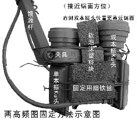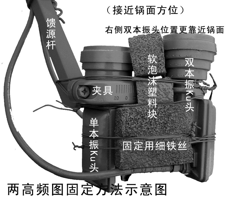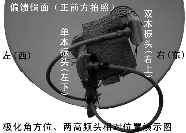 在调整好主收亚太2R卫星节目的基础上,手持双本振Ku高频头在单本振Ku高频头右上方5厘米左右距离晃动,要同时接好电视看信号质量,找到最佳接收位置。新!唐!人:对亚洲信号已经加强,调试时高频头左右晃动5公分都有信号,只是信号强弱不同。经调试得知,最佳的一锅双星偏收W5新!唐!人:的双本振Ku高频头的接收位置为:在主收亚太2R卫星单本振Ku高频头的右上方较靠上的方位,不向以前有同修所说的紧挨着,要相距5公分左右,两高频头平行,但接收新!唐!人:的高频头距离要较主收亚太2R卫星的高频头靠近锅面1—2厘米(见下图)。由于两高频头之间有约5厘米的距离,我是在中间垫了一块软泡沫塑料,用细铁丝绑住固定的。
