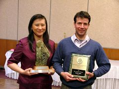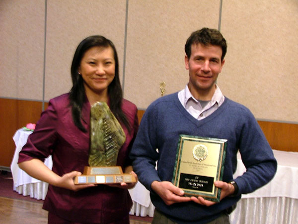 ![]() 法轮功学员代表领取最佳创意奖奖杯、奖牌 |