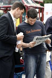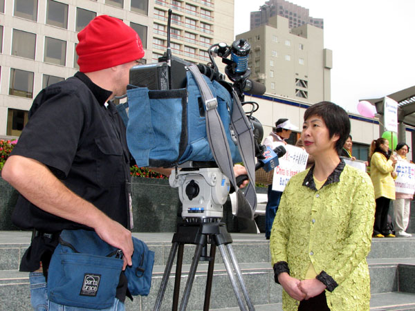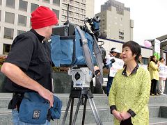 ![]() 电视台记者在采访参加集会的法轮功学员 |