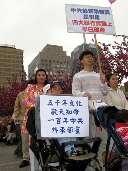 现居旧金山市、曾在中国任教授的余心白先生表示,他此次与几位朋友一起来,是为了表达自己的看法。他说,中共是一个从来不承认错误的政权,而且一直利用很多借口欺骗中国人,比如两会的召开并不能解决民众的实质性问题,所得出的结果并没有自己的主见,说的话也只是对党的拥护。