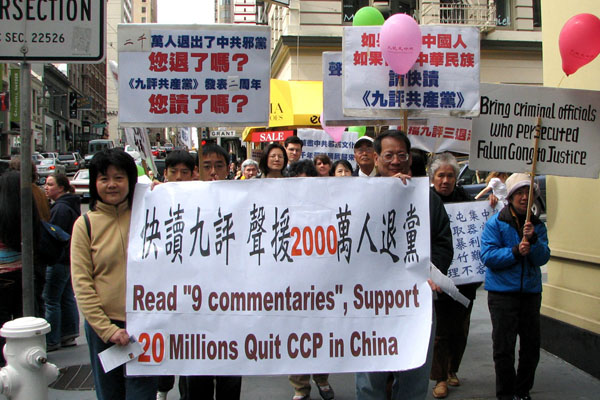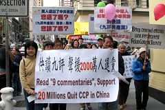 集会首先于上午十一时在旧金山市中心联合广场举行,中午十二时三十分,参加集会的人士沿着旧金山市的主要街道,游行至华人聚集的中国城花园角广场,举行中文集会。参加集会发言的人士以英文发言。自从·九·评*共产党社论于二零零四年发表以来,中国人退出中共的浪潮也引起了西方主流社会的关注。