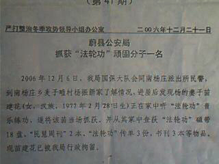 该“简报”的大致内容:二零零六年十二月六日,蔚县公安局国保大队伙同南杨庄派出所民警,到南杨庄乡麦子疃村杨振新家“了解情况”,进屋后发现杨的妻子苗建花(女,汉族,一九七七年二月二十八日生)正在家中听法轮功音乐炼功,遂将苗建花抓捕,并从其家中抄走法轮功磁带十八盘、《明慧周刊》二本、法轮功真相传单三份、大法书籍三本等物品。现苗建花已被蔚县公安局行政拘留。