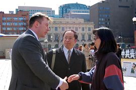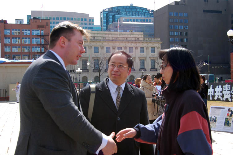 ![]() 在三月三十日“声援退!党!两千万”集会上,张继延公开宣布脱离中共使馆。 加拿大国会议员罗伯-安德斯(左)同张继延(右)握手表示支持。 |
