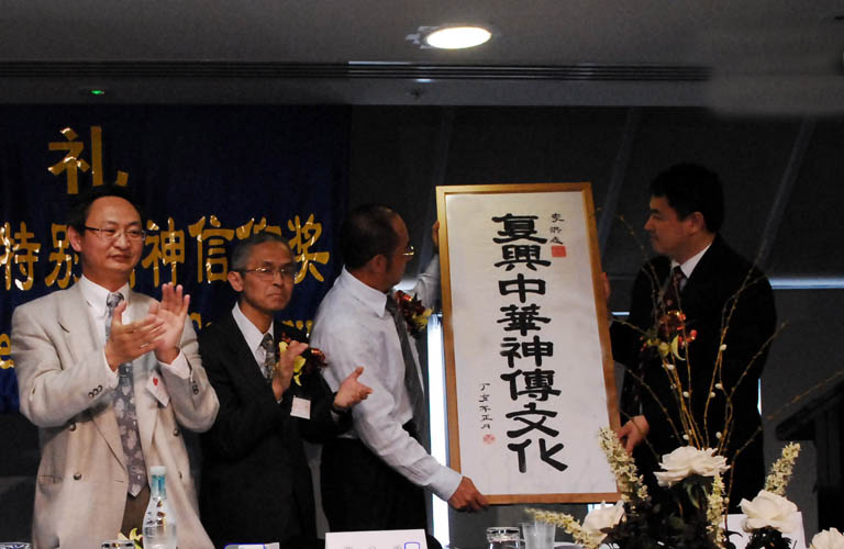 法轮功发言人张而平代表法轮功学员接受了中国自由文化运动向法轮功修炼团体颁发的“特别精神信仰奖”奖牌,并向自由文化运动转赠了法轮大法创始人李洪志先生的亲笔题词:“复兴中华神传文化”。