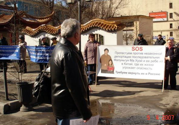 其一,近三年来,莫斯科有关当局,在中共的施压下,把中使馆前视为禁区,法轮功学员申请的一切活动一概不批。并违法抓捕在中使馆前抗议中共迫害法轮功的学员。更有甚者,法律明文规定不需准证的个人抗议,也被那些“执行上面命令”的警察取消,有的警察还威胁学员说:你再站在这儿,我就以你贩卖毒品抓走你。