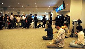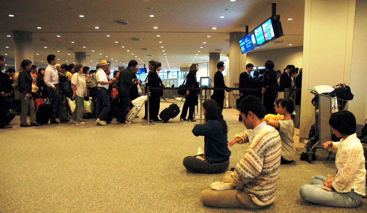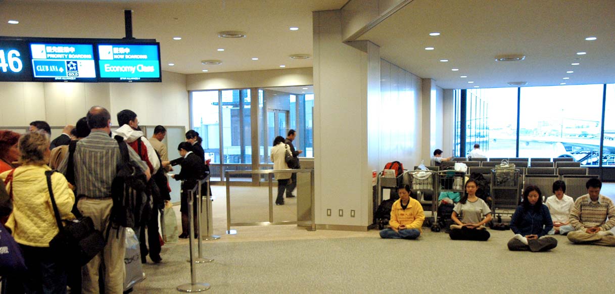 四月十一日晚,刚参加完美国纽约法会的新加坡学员,在回国途中,转机日本东京成田机场。他们发现众多的中国人在登机处等待,准备回北京。为了让这些中国人能了解真相,学员们一部份上前一处一处的讲真相,一部份则在显眼位置处静静的炼起了第五套功法。祥和的炼功场面给这些中国人很大的震撼。“哎,法轮功”,“这里没人管吗?”人们颇受震动,法轮功学员在海外的公共场合,包括机场,可以安静的不受干扰的炼功。即将登机的中国人交头接耳,带着这种震撼回国。