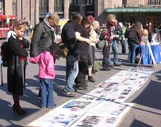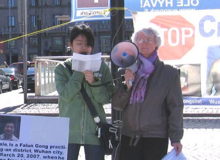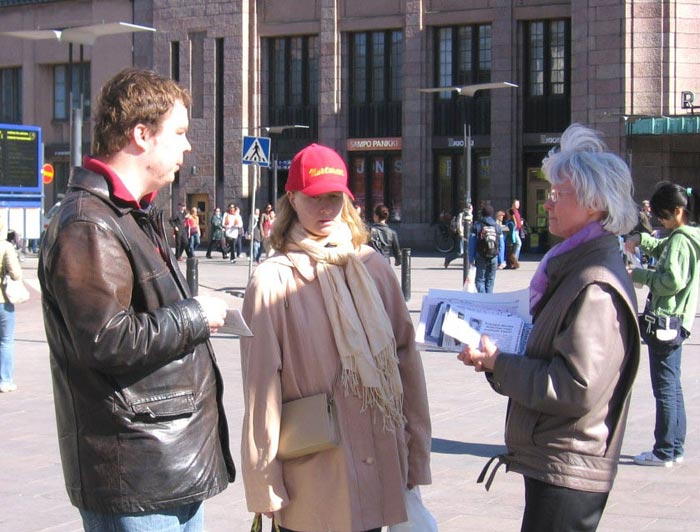 过往行人被横幅、展板上一幅幅惨不忍睹的照片、以及现场一位女学生的发言所吸引。这位女学生说到:“我叫Sunny,是今年一月份来赫尔辛基读大学的一名中国留学生。就在今年三月二十日下午,我的父亲——武汉市江岸区花北小区居民张伟杰突然失踪,经家人历经艰辛寻找数日,才得知仅仅因为他修炼法轮功,就被武汉市和江岸区“六一零”办公室在下班回家的路上将其绑架。这已经是他从九九年七月二十日中共迫害法轮功开始后,因为不放弃自己的信仰,第三次遭绑架,被强制洗脑、劳教;其间母亲也被抓进监狱一个月,监视居住一年。我的一个原本很和睦幸福的家就不见了,家里老人没人照顾,家庭经济困难。即便后来被放回,他们也一直被跟踪,家里电话一直被监听,没有一点人身的自由。中共的迫害给我们全家人的日常生活带来了不安与压力。