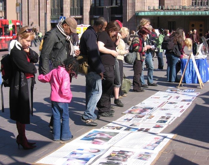 人们边听边看,明白了真相的立即上前签名声援反迫害。还有的找到学员问:中共为什么迫害法轮功? 我们能做些什么?芬兰政府做了什么?你们做的好,做的对,就是要让全世界的人都了解这个迫害真相。