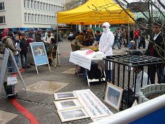 在后面,有一个法轮功学员蹲在一个笼子中,模拟中国法轮功学员在看守所里受到的非人道迫害。这些已经在德国不同的城市,以及全世界演示过很多次的场景打动了人们。有些人拿了两位加拿大独立调查员乔高和麦塔斯的关于中共活摘法轮功学员器官的调查报告,以了解中共对法轮功学员的器官掠夺。也有行人想学法轮功,并留下了联系地址。一些学生表示要在学校里做关于中国的报告,想拿些资料。一个男子在全面了解情况后说,他愿意把所有的信息公开登在他的个人网页上。