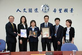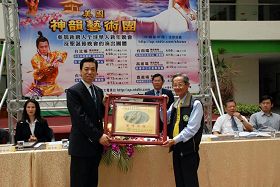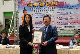 ![]() 嘉义县长陈明文(右)颁赠感谢状:艺术瑰宝 世界之光 |