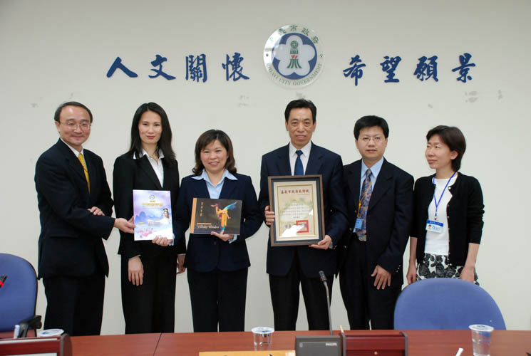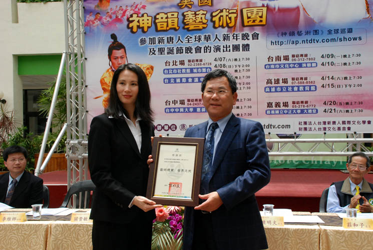 ![]() 嘉义市长黄敏惠(左三)颁赠感谢奖牌给神韵艺术团 |
