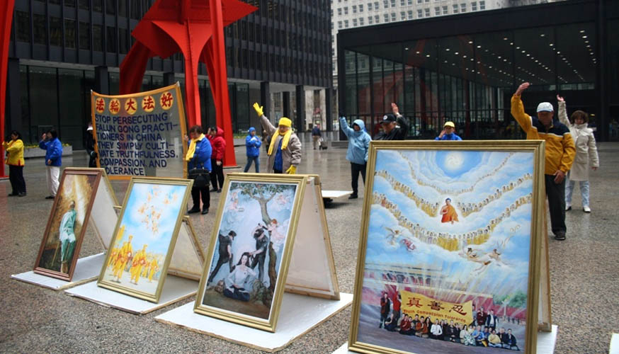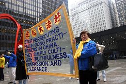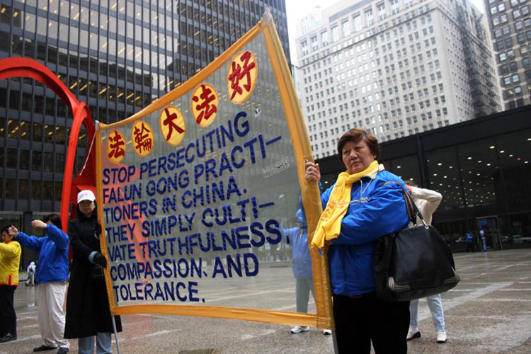 ![]() 芝加哥法轮功学员冒雨在市中心的联邦广场举行纪念“四·二五”活动 |