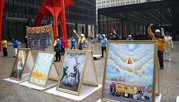 然而,法轮功学员们和平、理性的抗议活动是不会被世人遗忘的。在芝加哥的联邦广场上,一位穿着得体、手持一束鲜花的女士认真的观看了每一幅画,向学员表示,她非常喜欢这里的画。在了解了法轮功学员经受的迫害后,她默默的把手里的鲜花送给了在场的一位大法小弟子,以表达她的敬意;同时把学员递上的真相资料放進她的书里,以不至于被雨淋湿。