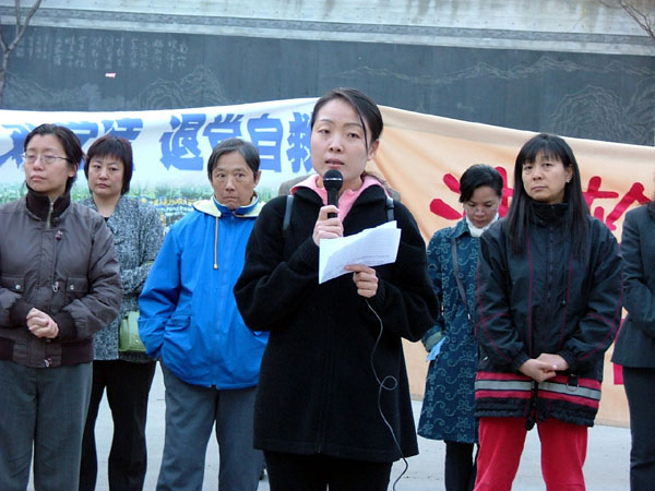 集会主持人竹学叶说:“法轮功学员八年反迫害,不仅仅是为了自己,是为了更多的人们。当年参加‘四・二五’上访的法轮功学员,他们是以多么无畏的心情、多么慈悲的胸怀,来对待即将公开化的迫害。他们心中装着的不是自己,是千千万万渴望按真善忍做人的人们;他们心中装着的不仅仅是自己的亲人,还有他们不曾见面、也许永远不可能见面的、全世界的能有机会修炼法轮大法的人们。法轮功学员的心中甚至装着那些可能对他们举起屠刀的,被中共欺骗、利用的人们。“