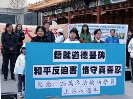 “八年来不断的有人明白法轮功被迫害的真相、中共的邪恶,以及了解了法轮大法的美好,走入修炼中来。我们也深知还有许多人不了解、被中共的谎言蒙蔽,不愿了解法轮功真相的人们。在此我们告诉大家,我们会一如既往的恪守真善忍的原则,不断的把真相和法轮大法的美好带给人们,同时也希望同胞们能抓紧有限的机缘,认清中共的邪恶,不要再被欺骗,不要随天灭中共而做陪葬。”