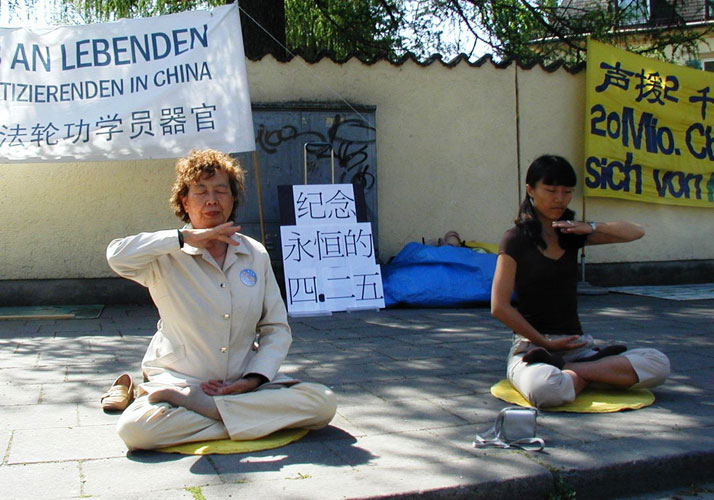 ![]() 法轮功学员在慕尼黑中领馆前纪念“四·二五” |
