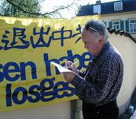 在慕尼黑中领馆对面,法轮功学员打出了“纪念永恒的四·二五”标语,横幅上分别写着“中共活体摘取法轮功学员器官”、“声援两千万人退出中共”,提醒世人中共对法轮功学员的残酷迫害以及当前势不可挡的退!党!大潮。