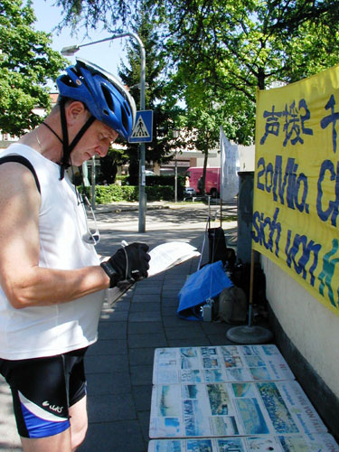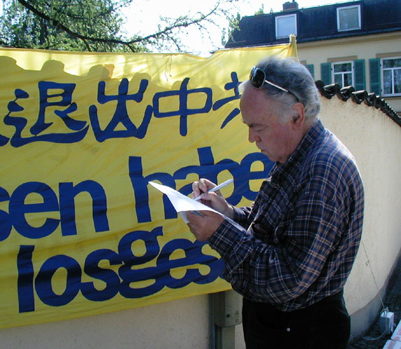 过路的格拉芙女士(Graf)得知中共活体摘取法轮功学员器官一事后,立即在签名簿上签名,谴责中共这一非人行径。她表示必须付诸行动,才能让德国政府出来说话。她又要了好多资料,希望能发给她的熟人。