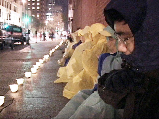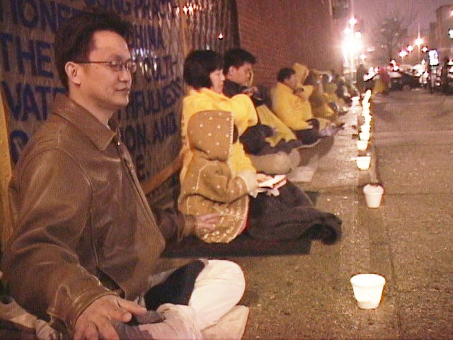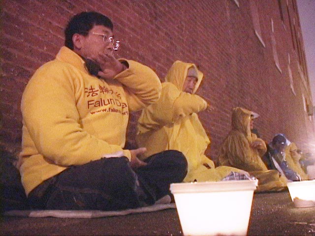 【明慧网二零零七年四月二十七日】结束了白天在芝加哥市中心联邦广场(Federal Plaza)举行的集体炼功活动后,二零零七年四月二十五日晚上,部份芝加哥法轮功学员再次聚集在中领馆前。丝丝冰雨中,他们以烛光守夜的形式纪念