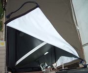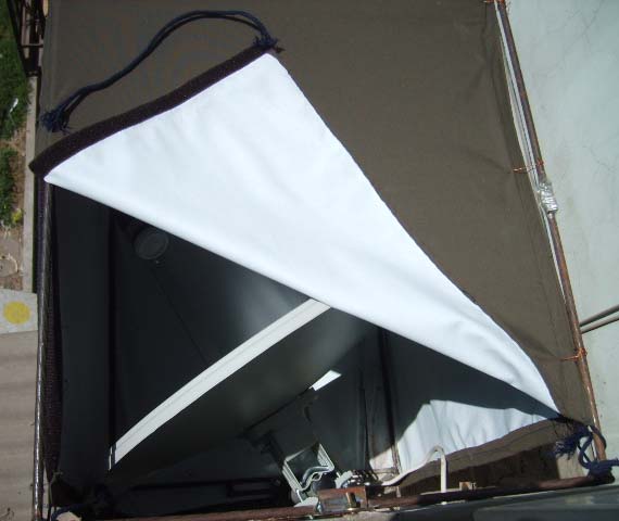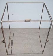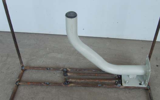 1、 用6mm钢筋焊一个长方形框架,如果用55cm中卫KU天线,框架尺寸为高70cm,宽55cm,长60cm。如果用45cm杂牌KU天线,框架尺寸为高62cm,宽45cm,长45cm。在框的一侧焊两个轨道(调整支架位置用),焊上三个固定用的铁耳朵(见图4),按照框架的尺寸做好布套(可到布匹批发市场批发,有一种防雨绸,里面有一层胶,很结实,软硬适中,不挡信号,1.5米宽,批发价格约为4元一米。上盖用粘式拉锁固定。)