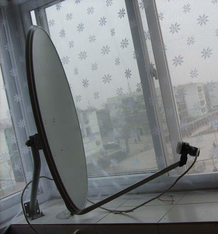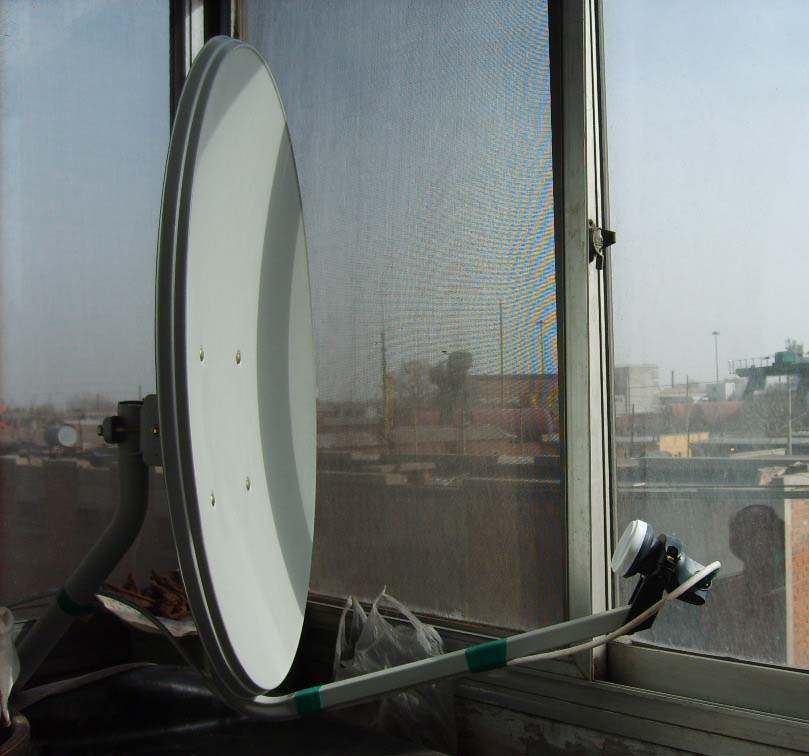 2、如果用户窗外没有铁罩子,可考虑在窗内接收。我们一般采用60cm或75cm的中卫天线,先把天线安装在可升降支架上(可用落地扇支架),装好KU双本振高频头,打开窗户,用亚太2R卫星上的西藏台确定大致方位,输入本振频率10600,下行频率12374,符号率05660,极性为垂直,22K为开,量好仰角(亚太2R卫星),轻轻转动,很快就出来了。再输入新!唐!人:数据:本振频率09750,下行频率11334,符号率06511,极性为垂直,22K为关,然后把仰角向下降4度,向西转一点就出来了。熟练后可不用支架,直接在窗台上晃动就可找到。确定好准确位置,做好记号,把原配支架固定好(或另做支架),再装上天线,从新调试即可。调好后关上窗户,看能否收看,如不行,只能开窗收看,用厚一些的塑料膜把窗户封上,可起到防风防尘防雨的作用,对接收没有影响。