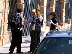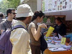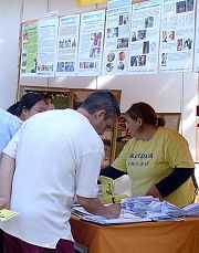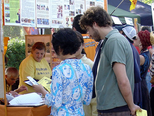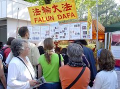 看到揭露中共暴行的横幅和图片,人们停下匆匆的脚步,认真阅读传单、向学员了解更多的真相 |