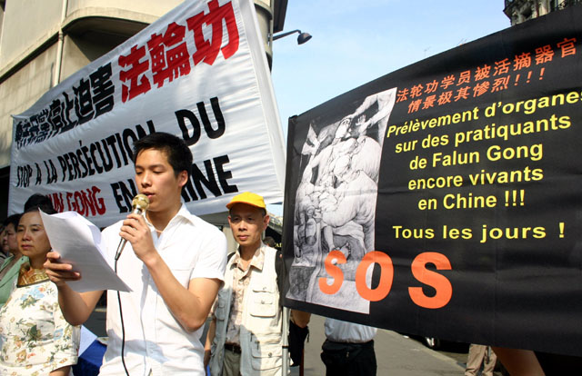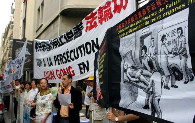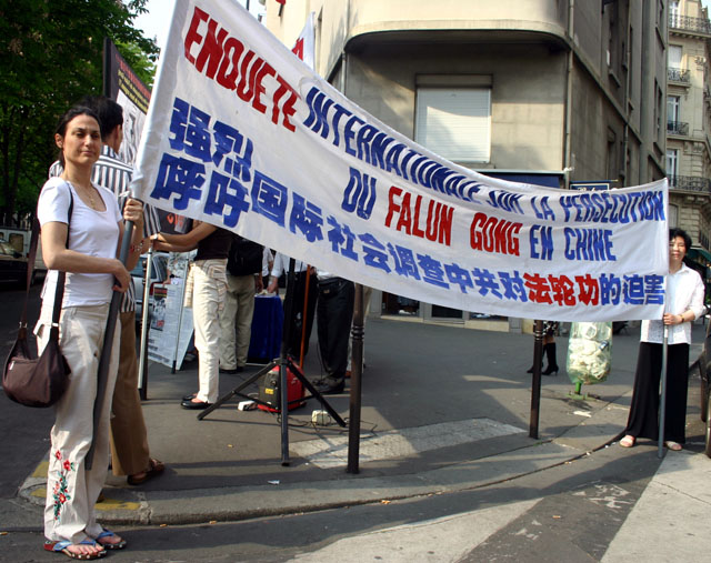 巴黎法轮功学员在中共驻法使馆前打出「中共邪*党-停止迫害法轮功」、「中共活体摘取法轮功学员器官」等横幅和揭露中共罪恶的真相图板。