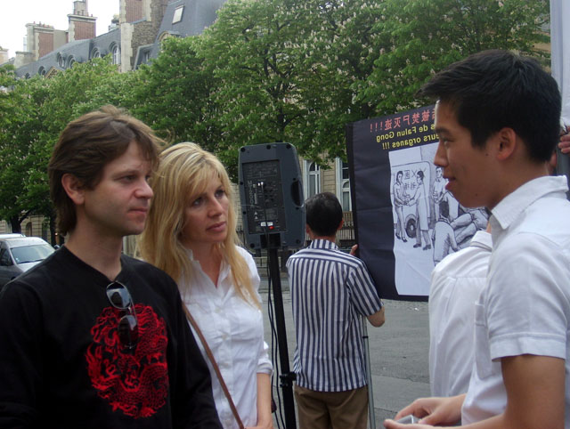 一位法国老先生和法轮功学员交谈了许久后,知道了迫害真相,并当场用话筒即兴演讲,他说:「我觉的所有的人都应该有自由,这毫无例外。中国人有那么古老的文化、悠久的历史,他们没有理由没有自由, 对法轮功的这种迫害这是反人类的罪行,我尽我的力量让更多的人知道这场可怕、残酷的迫害。」