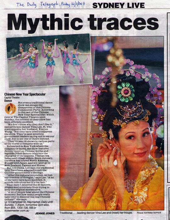 三月三十日,澳洲最大的报纸之一 ——悉尼晨锋报对晚会作了大幅的图片报导,同时澳洲另一家主要报纸《每日电讯》还采访了舞蹈演员李维娜,以《神话世纪》为题作了大篇幅的报导,同时披露了中共的独裁与脆弱,即使一个中国传统舞蹈的晚会都会令中共惴惴不安。