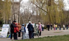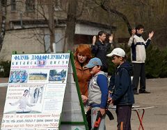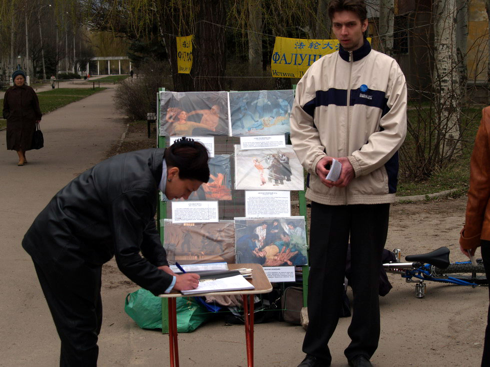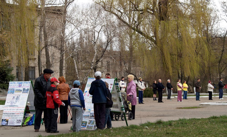 学员在公园里竖起了真相展板,并在一旁演示五套简单易学的功法。路过的行人有的驻足观看着展板,有的与在旁边的法轮功学员交谈、了解真相,也有的被功法吸引后上前拿取洪法真相资料,还有的了解了真相的人们主动要签名谴责中共迫害法轮功的暴行。