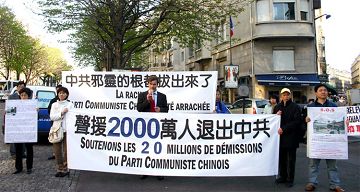 集会中,集会者用中法文通过高音广播向中共驻法使馆的所有工作人员提出警示:天灭中共在即,停止继续跟随中共邪*党-迫害法轮功,不要做中共的陪葬品,呼吁他们为自己的前途命运着想,赶快行动起来加入三:退.的行列。