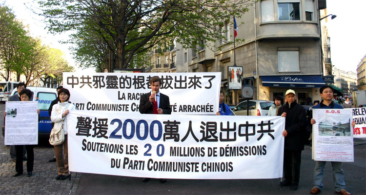 全球.退:党!服务中心法国分部代表胡先生在演说中对中共使馆的外交官员、工作人员疾呼,「唾弃中共,退!党!保命的洪大趋势下不要犹豫,看清中共是罪恶的根源,为了自己的身家性命,三:退.自救」。