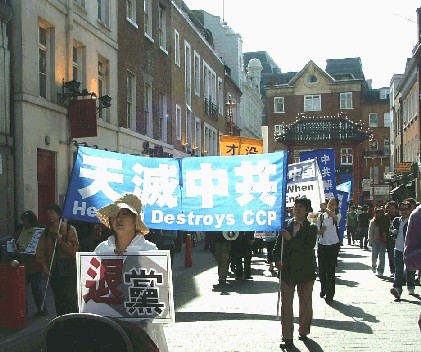 集会后,游行队伍从中使馆前出发,沿伦敦市中心最繁忙的Regents Street,三次横穿著名的伦敦中国城,最后在St. Martin广场结束,历时三个半小时。当天伦敦阳光灿烂,市中心游人如织,车水马龙。游行队伍所到之处,人们驻足观看,几千份中英文资料散发一空。在游行的终点,几位中国游客特意在“天灭中共,退!党!保命”的条幅前合影留念。