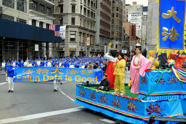 第一方阵展示大法美好,花车开路,其后五个小方阵:天国乐团,仙女队,炼功队,大法洪传,腰鼓队。