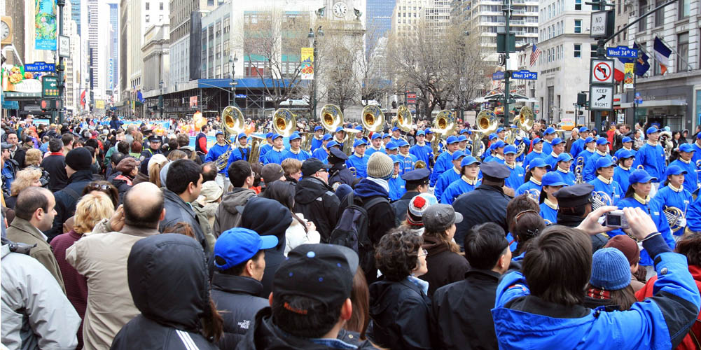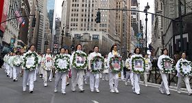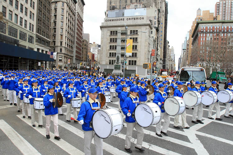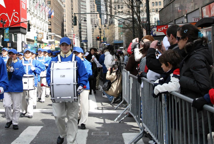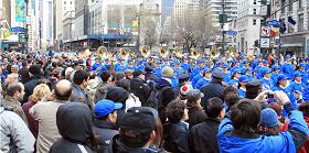 中英文大横幅“法轮大法好”引领着三百人的天国乐团,乐手们精神饱满,一路自如的吹奏着雄壮的乐曲:“法轮大法好”、“法鼓法号震十方”、“法正乾坤”,乐声雄浑激昂,在曼哈顿的上空飘扬。