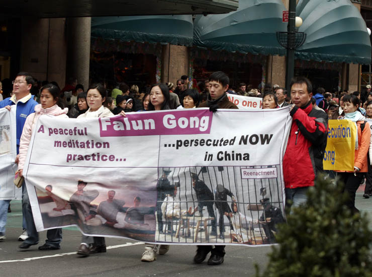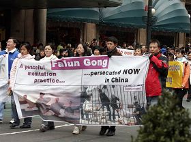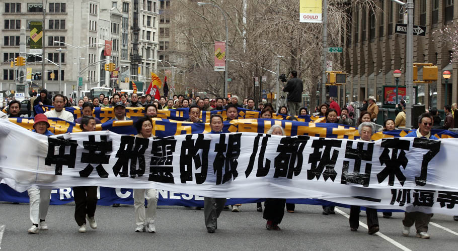 游行分为三个主题:歌颂大法美好,曝光迫害,声援退!党!潮。
