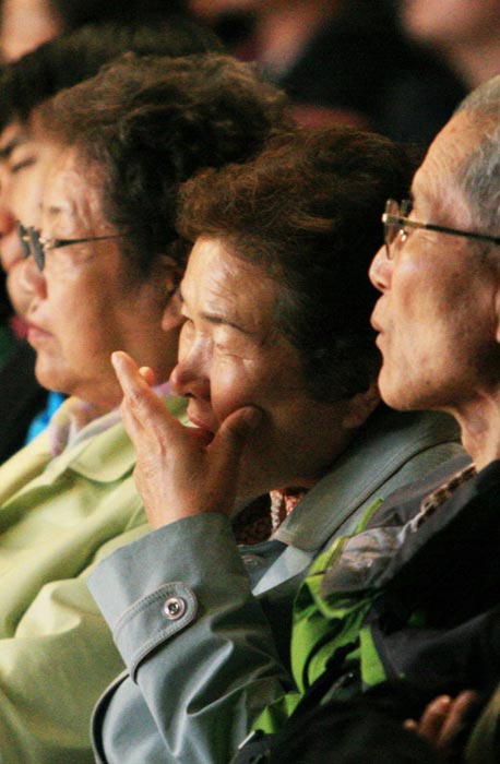 画面中落泪的韩国男士们也许是不习惯带手帕,他们中许多只能以手掩面拭泪或是外套擦泪。也许这时只有关贵敏所唱的《我是谁》歌词,「天地茫茫我是谁,记不清多少次轮回,苦难中无助的迷茫,期盼的心如此的累,黑夜中流出的是沧桑的泪。」能形容他们的心境吧!