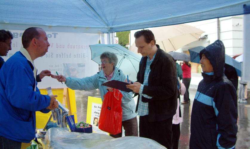 这天,瑞士普遍降雨,可是仍有不少人冒雨认真的看真相展板,而且,不断有人索要真相资料。两位青年人认真看完真相图片后说,中共太坏了,我们是中国功夫学校的,请给我们签名表,我们发给学校的学生,让更多的人了解中共的邪恶,来签名谴责中共的暴行。