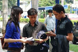 活动中法轮功学员向过往的印尼民众讲清真相。了解真相的民众都知道法轮大法好,中共邪恶。