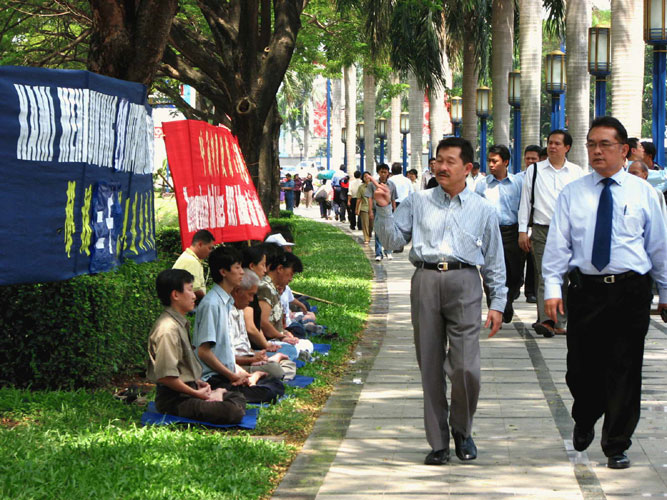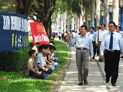鉴于在印尼,最近连续两次发生因中共干扰而使法轮功学员参与的正常活动被无理由取消,致使印尼法轮功学员的公民权利被恣意践踏,因此法轮功学员来到中使馆前,谴责中共的卑劣行径,呼吁使馆人员不要再被中共蒙骗,在退!党!人数已经超过二千一百万的今天,要认清中共的邪恶本质,天灭中共是必然的结果,趁如今还有选择的机会,给自己选择走向未来的路。