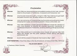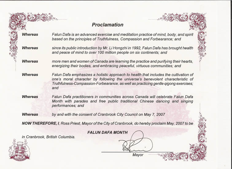 鉴此,我,罗斯•普莱斯特(Ross Priest),克兰布鲁克市市长,特此褒奖二零零七年五月为“法轮大法月”。