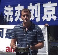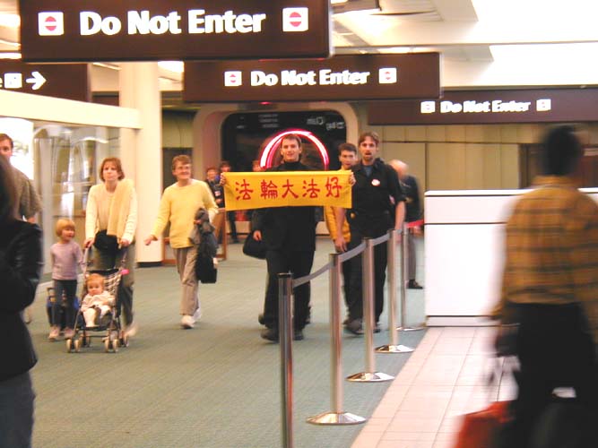 二零零一年十一月,十多个国家的三十六名法轮功学员在天安门广场展开“真、善、忍”的横幅。当时已修炼半年的杰瑞德被深深触动了,他觉的自己也应该去。当他和哥哥考特交流了这个想法之后,考特说他们当然应该去。