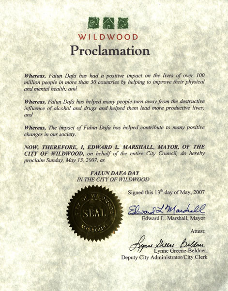 因此,我,维尔德伍德市(Wildwood)市长EDWARD L. MARSHALL,现在代表整个市议会特此宣布二零零七年五月十三日星期天为维尔德伍德市