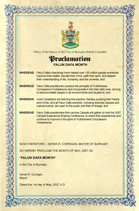 因此,我德瑞克 。 柯瑞根(Derek R. Corrigan),本拿比市市长特此宣布二零零七年五月为本拿比市的“法轮大法月”。