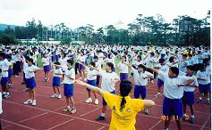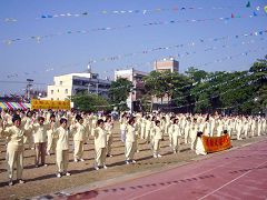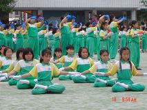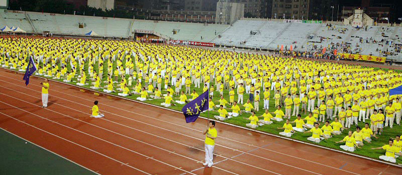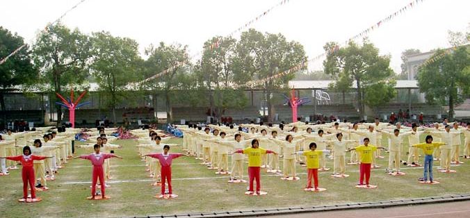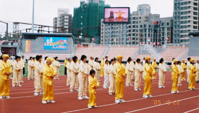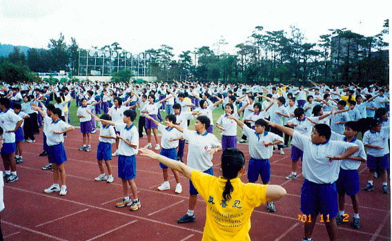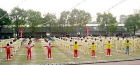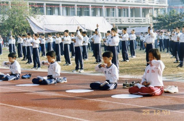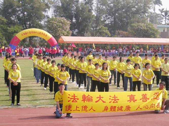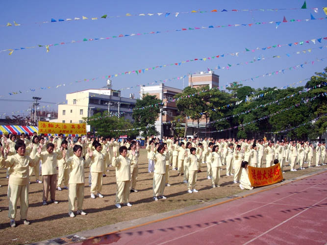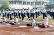 屏东市区的一所中心学校庆祝创校七十八周年的运动会上,由五年级的三百多位修炼法轮功的小朋友演示功法。