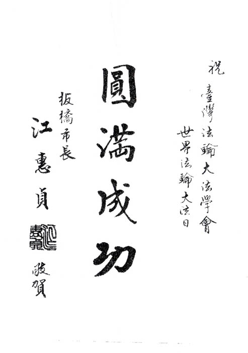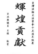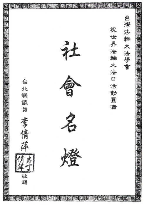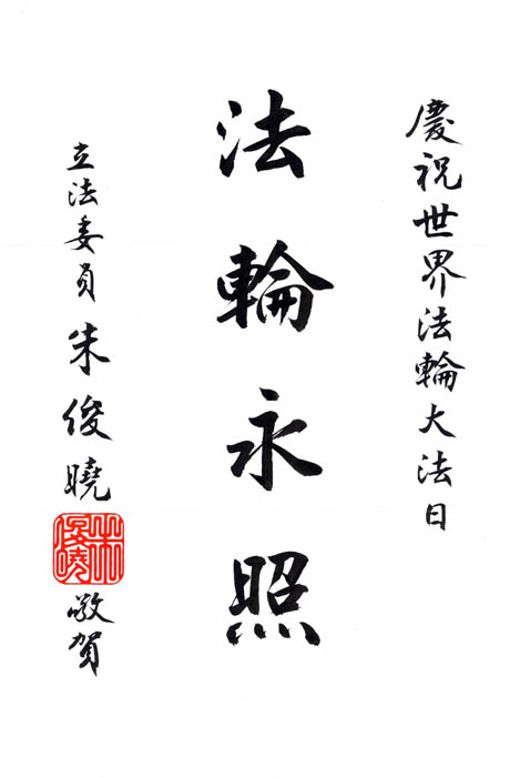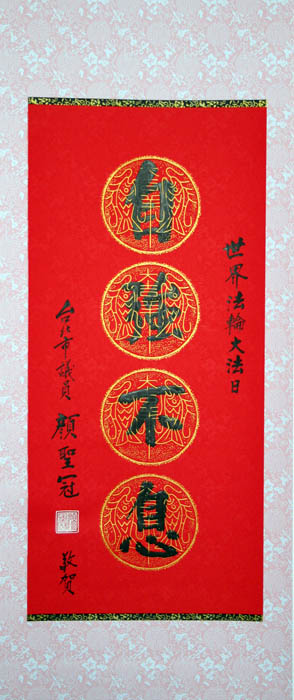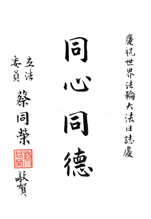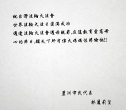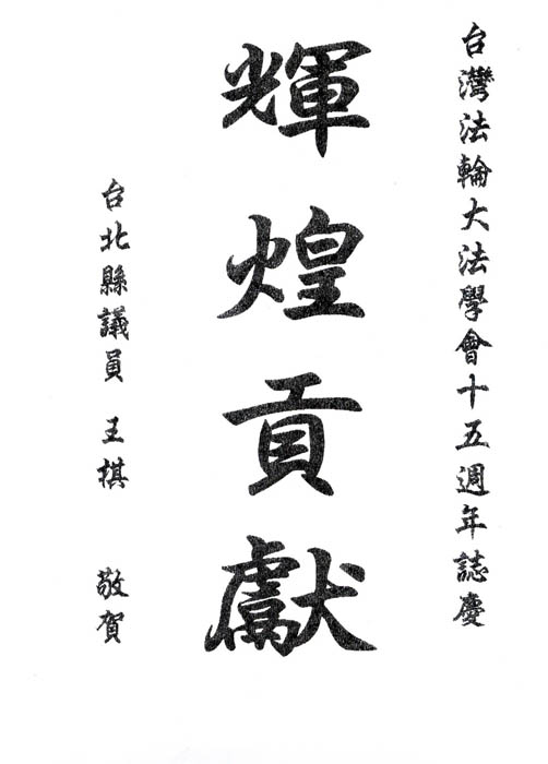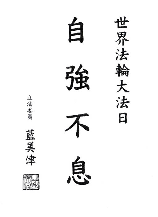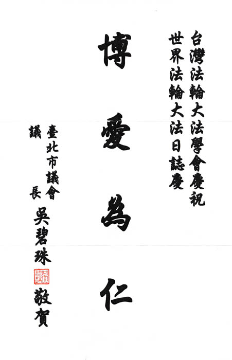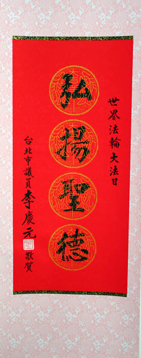 今年的台湾「庆祝世界法轮大法日」,将在台北市举办游行活动,并在中正纪念堂排字炼功。同时也邀贵宾共襄盛举,现已获得台北市议会议长吴碧珠、板桥市长江惠贞、台北市议员李庆元、颜圣冠、台北县议员李倩萍、王棋、立法委员蓝美津、朱俊晓、蔡同荣及芦洲市民代表等多人的贺辞、珍文与墨宝等。