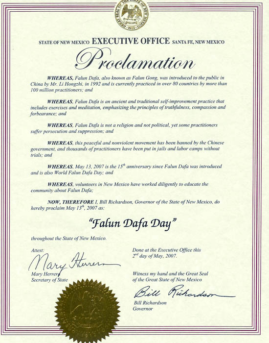 鉴此,我,比尔•理查德逊(Bill Richardson),新墨西哥州州长,在此宣布二零零七年五月十三日为整个新墨西哥州的