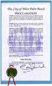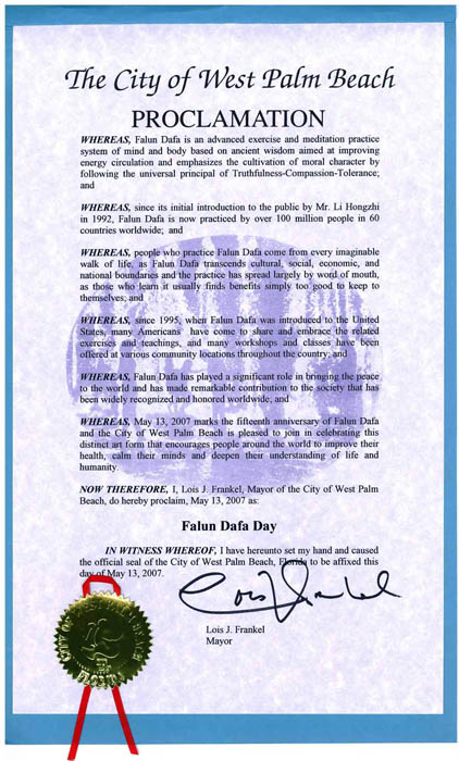 鉴于,二零零七年五月十三日标志法轮大法洪传十五周年,西棕榈滩市很高兴在此刻共同庆祝这一与众不同的,鼓励世界上的人们改善健康,净化心灵,更加深刻的了解人类生命的功法。